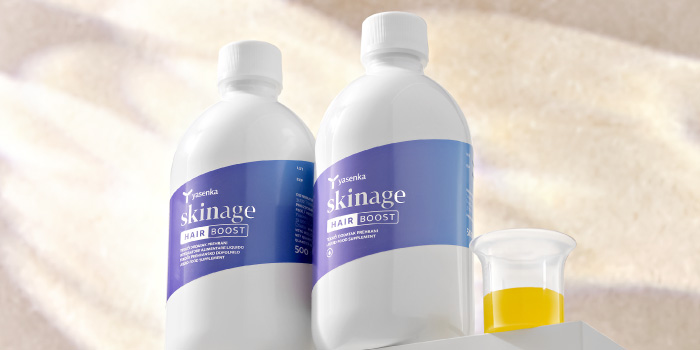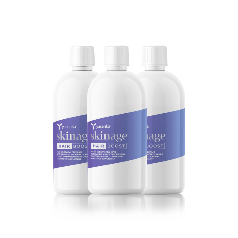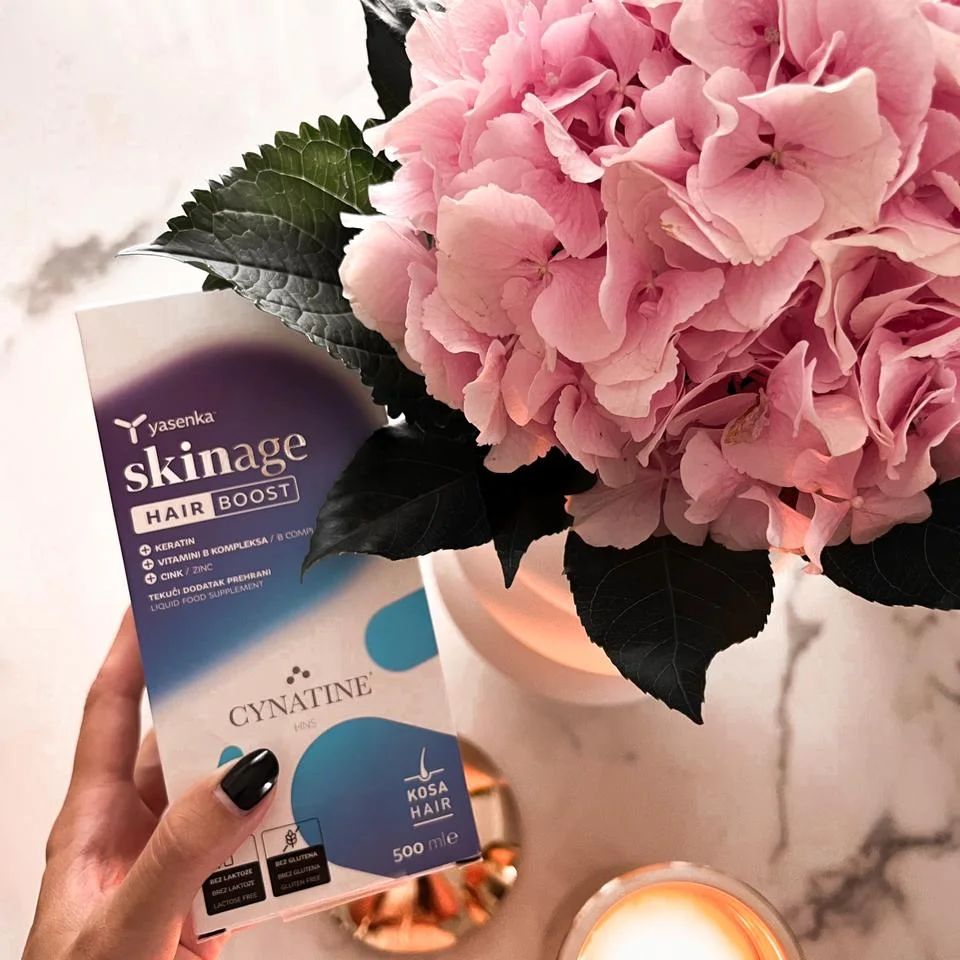 Dodatak ishrani za negu kose sadrži kombinaciju Cynateine HNS, kompleks vitamina B i cinka. Keratin je glavni građevinski blok kose i noktiju i čini 80% hemijskog sistema kose. Keratin, koji gradi kosu i nokte, sastoji se od aminokiselina povezanih u alfa heliksu. Sadrži velike količine amino kiseline cisteina, koja je povezana disulfidnim vezama i formira cistin. Dvostruke veze unakrsno povezuju keratinske lance. Broj veza zavisi od tipa kose, a veći broj obezbeđuje bolju čvrstoću i oblik kose, kao i otpornost na hemikalije i mehanička oštećenja. Tečni oblik keratina obezbeđuje bržu apsorpciju i veću iskorišćenost, što doprinosi lepoti vaše kose dugoročno. Keratin za kosu skinage Hair Boost.